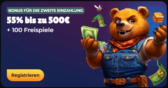 Die zweite Einzahlung bringt laut Angaben 55% bis 500 € + 100 Freispiele. Das wirkt wie ein „Reload light“: weniger Prozent als beim Start, dafür noch einmal Freispiele als Extra.